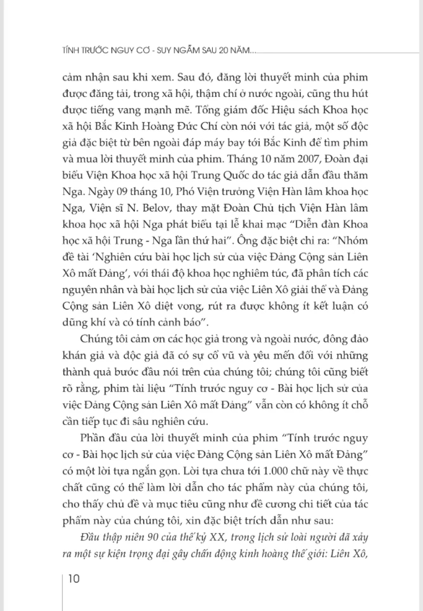 Tính Trước Nguy Cơ - Suy Ngẫm Sau 20 Năm Đảng Cộng Sản Liên Xô Mất Đảng Cuốn sách Tính Trước Nguy Cơ – Suy Ngẫm 20 Năm Đảng Cộng Sản Liên Xô Mất Đảng là kết quả của đề tài “Nghiên cứu bài học lịch sử của việc Đảng Cộng sản Liên Xô mất Đảng” của Viện Khoa học xã hội Trung Quốc và sau đó đã được đưa vào dự án thuộc Quỹ khoa học xã hội nhà nước của Trung Quốc. Đứng từ góc độ nhà nghiên cứu đồng thời là đảng viên ở một nước do Đảng Cộng sản nắm quyền, lãnh đạo, trên quan điểm của chủ nghĩa Mác, cuốn sách đi sâu phân tích một cách khoa học, logic những nhóm nguyên nhân chính dẫn đến sự suy yếu trong lãnh đạo, cầm quyền của Đảng Cộng sản Liên Xô, những điều rút ra từ việc nghiên cứu bài học mất Đảng của Đảng Cộng sản Liên Xô cho đến nay vẫn còn nguyên giá trị lý luận và thực tiễn đối với các đảng cộng sản đang nắm quyền. Với cách trình bày khoa học, lập luận rõ ràng, cuốn sách là tài liệu tham khảo bổ ích đối với bạn đọc, nhất là các nhà hoạch định chính sách, các nhà nghiên cứu, cán bộ lãnh đạo trung và cao cấp, những người làm công tác đảng, học giả, giảng viên, nghiên cứu sinh chuyên ngành lịch sử, xây dựng Đảng
