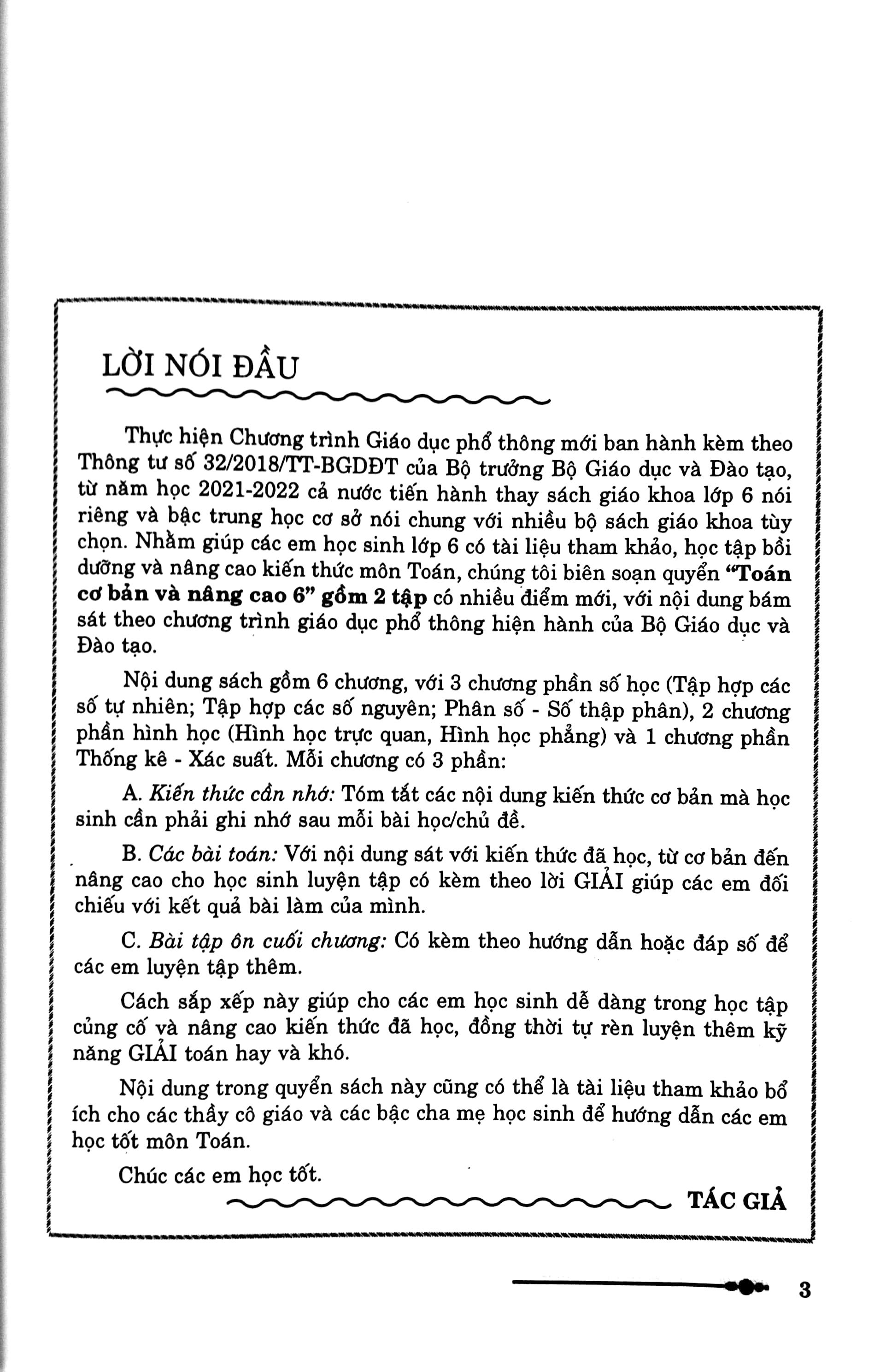 Thực hiện Chương trình Giáo dục phổ thông mới ban hành kèm theo Thông tư số 32/2018/TT-BGDĐT của Bộ trưởng Bộ Giáo dục và Đào tạo, từ năm học 2021-2022 cả nước tiến hành thay sách giáo khoa lớp 6 nói riêng và bậc trung học cơ sở nói chung với nhiều bộ sách giáo khoa tùy chọn. Nhằm giúp các em học sinh lớp 6 có tài liệu tham khảo, học tập bồi dưỡng và nâng cao kiến thức môn Toán, chúng tôi biên soạn quyển “Toán cơ bản và nâng cao 6” gồm 2 tập có nhiều điểm mới, với nội dung bám sát theo chương trình giáo dục phổ thông hiện hành của Bộ Giáo dục và Đào tạo.