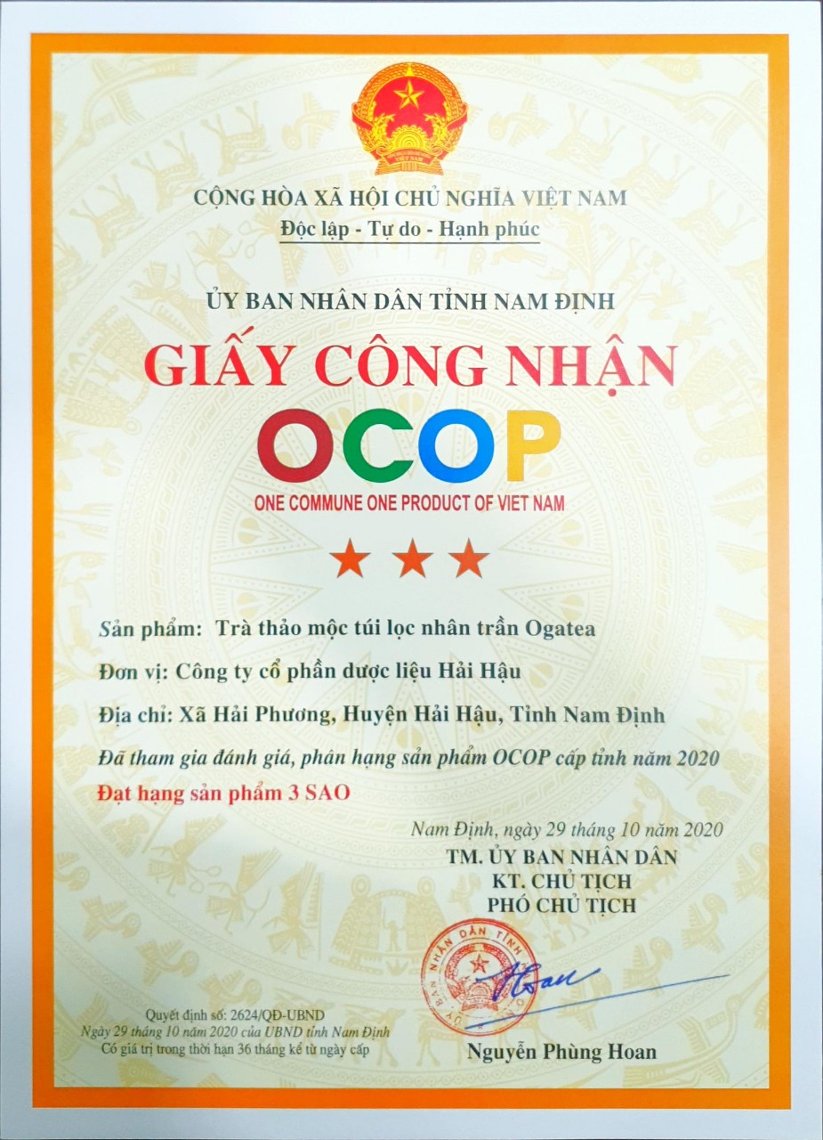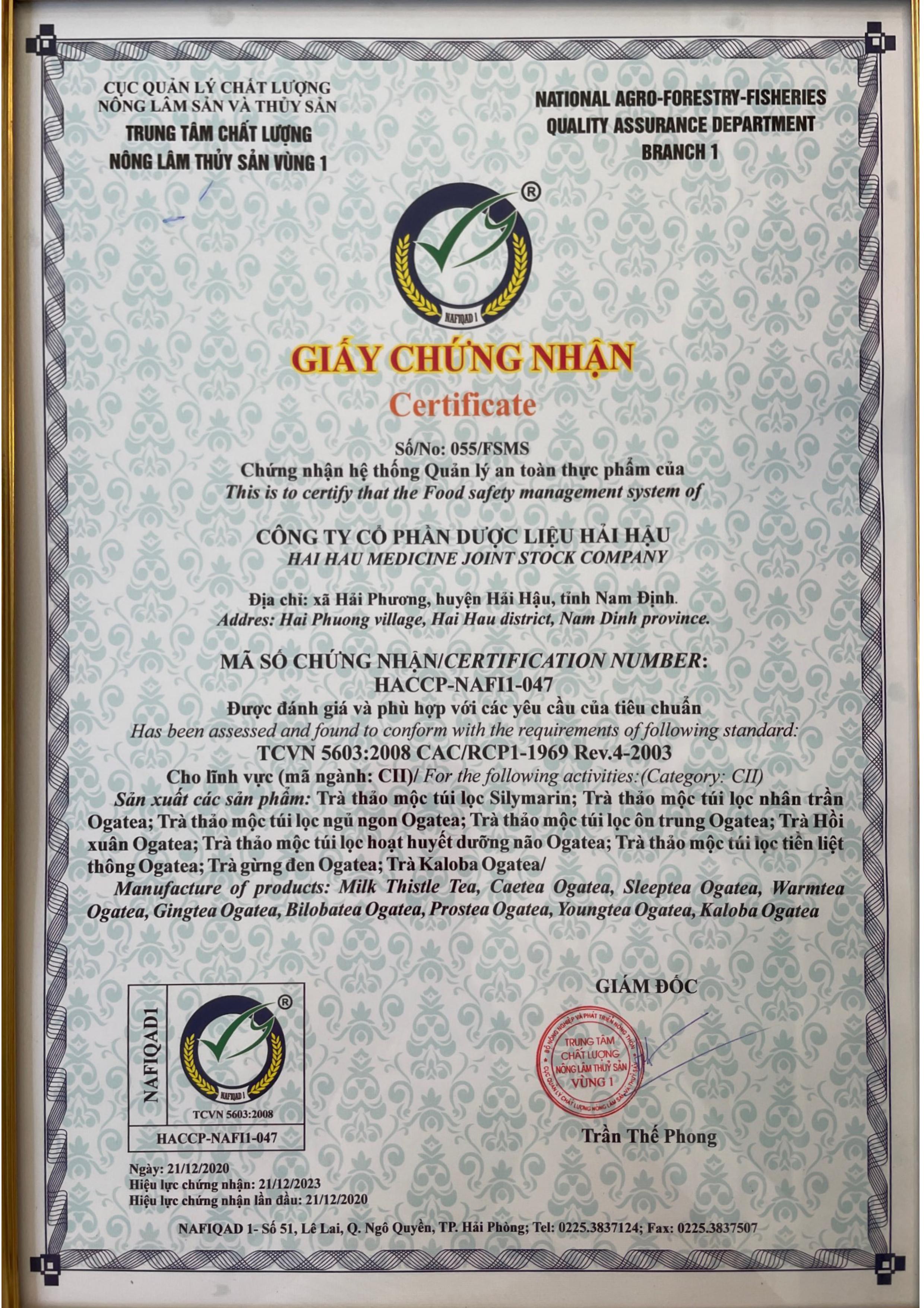 Chỉ cần ít phút có ngay cốc trà ngon, hương vị đậm đà. Sử dụng tiện lợi nhờ vào sự sáng tạo trong quy trình sản xuất Ogatea. Trà nhân trần Ogatea giúp thanh nhiệt Thành phần Cao nhân trần: 100mg Nhân trần: 2,8g Cam thảo: 100mg Hướng dẫn pha trà Nhúng túi trà vào cốc nước Ngâm trà khoảng 2-3 phút Thêm đường và đá nếu bạn thích uống mát lạnh Chú ý: Nên sử dụng ngay sau khi pha hoặc sau khi pha cất trong tủ lạnh và sử dụng trong 12 giờ Hướng dẫn bảo quản Nơi khô ráo Khối lượng tịnh: 75g (25 túi x 3g) Sản xuất tại Công ty cổ phần dược liệu Hải Hậu Số công bố: 02/DLHH/2019 GCNATTP: 090/2018/NNPTNT-NĐ Hạn sử dụng: Hai năm kể từ ngày sản xuất