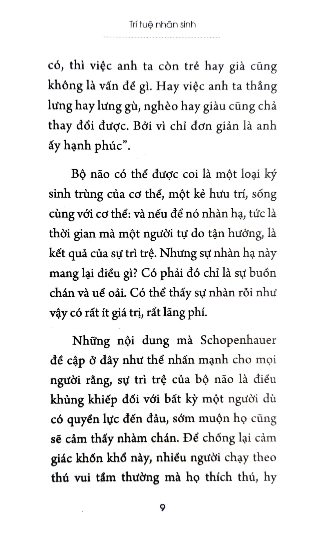 Trí Tuệ Nhân Sinh GIỚI THIỆU TÁC GIẢ: Arthur Schopenhauer, một trong những triết gia vĩ đại của nước Đức, nổi tiếng với những quan điểm đầy sáng tạo và phản biện sâu sắc về cuộc sống và nhân sinh. Ông được biết đến với việc khuyến khích một lối sống đơn giản, khổ hạnh và chay tịnh, mặc dù trong cuộc sống cá nhân ông lại thích ăn thịt, uống rượu vang và mê mẩn phụ nữ. Schopenhauer đã mở rộng và phát triển triết lý Kant về cách con người trải nghiệm thế giới, đặc biệt là trong việc khám phá sâu sắc về bản chất của khổ đau và sự vô ích trong cuộc sống. Triết gia này không chỉ nổi tiếng với sự độc lập tư tưởng mà còn với sự dám nghĩ, dám nói và sự sâu sắc về tâm lý con người, tạo nên dấu ấn sâu sắc trong lịch sử triết học thế giới. GIỚI THIỆU TÁC PHẨM: TRÍ TUỆ NHÂN SINH – CUỘC DẠO CHƠI CỦA MỘT “ĐỘC CÔ” GIỮA CUỘC ĐỜI. Trí Tuệ Nhân Sinh của Arthur Schopenhauer là một tác phẩm triết học sâu sắc về hạnh phúc và ý nghĩa cuộc sống. Trong cuốn sách này, Schopenhauer đề cập nhiều điều thú vị mà bạn đọc có thể chiêm nghiệm và tự rút ra cho mình những bài học quý giá. Ông cho rằng, những gì một người có ở bản thân mình, cùng với mục tiêu cuộc sống của anh ta, là yếu tố trực tiếp dẫn đến hạnh phúc và phúc lợi của người đó. Tất cả những thứ khác chỉ là trung gian và gián tiếp và ít bị ảnh hưởng. Schopenhauer lập luận, con người có thể dễ dàng chịu đựng một điều bất hạnh đến từ bên ngoài dễ dàng hơn là điều bất hạnh từ bên trong. Vận mệnh có thể thay đổi, nhưng tính cách thì không. Vì vậy, những phước lành từ chủ quan, một bản chất cao thượng, một cái đầu có năng lực, một tính khí vui vẻ, tinh thần trong sáng, một thể chất khỏe mạnh, là những yếu tố đầu tiên và quan trọng nhất của hạnh phúc. “Đừng nên kỳ vọng nhiều vào người khác, hay nói chung là đừng nên kỳ vọng từ thế giới bên ngoài” – như một châm ngôn đúng với bất kỳ ai! Chính bản thân mình là nguồn gốc của những điều tốt đẹp nhất mà con người có thể đạt được. Càng đúng hơn khi khẳng định – một người càng vui vẻ hạnh phúc hơn khi tìm thấy nguồn vui trong chính mình.