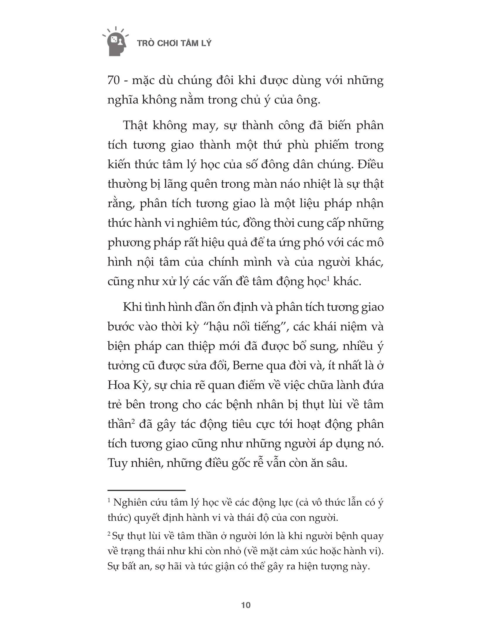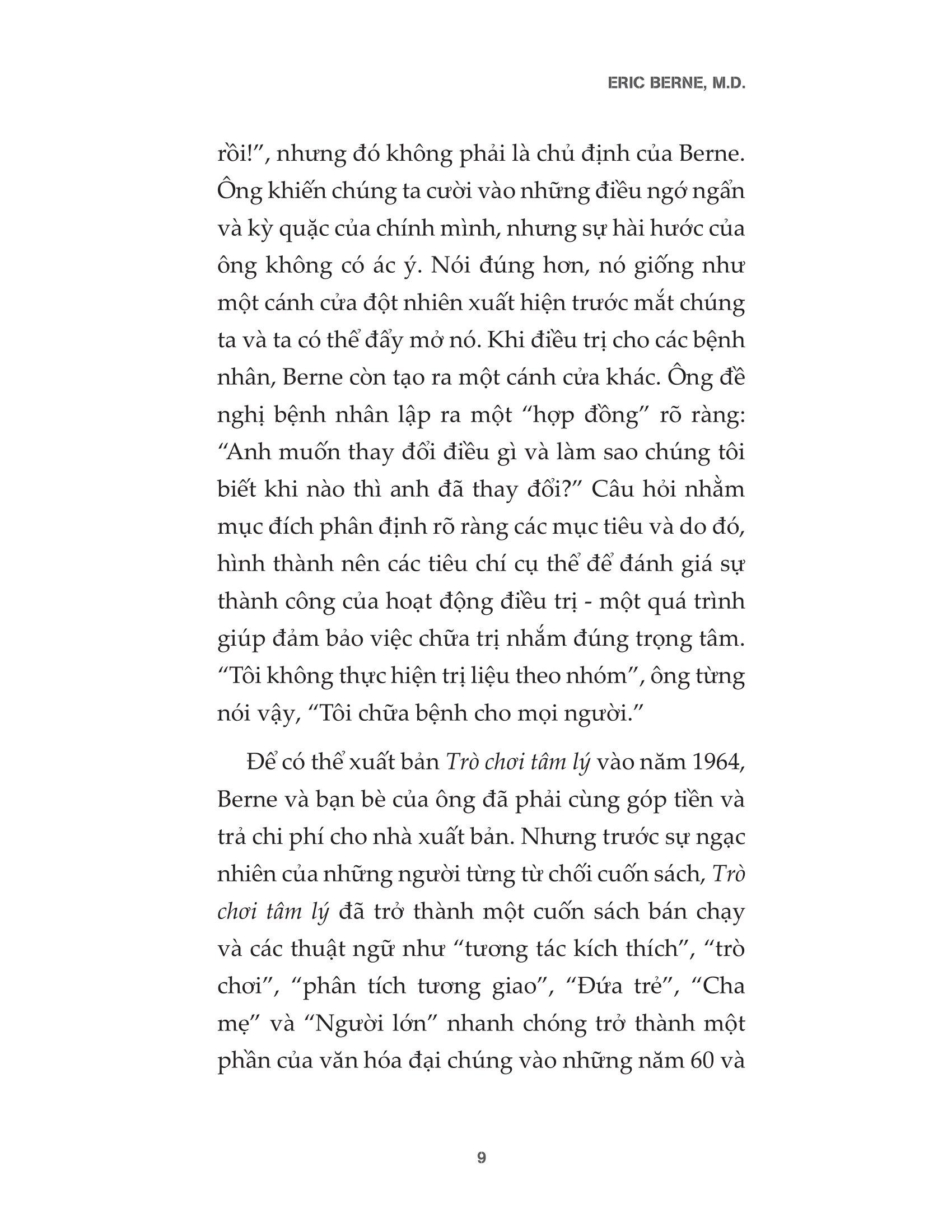 “Trò chơi tâm lý” là một cuốn sách kinh điển về hành vi của con người, giải thích những trò chơi tâm lý hoang dã và thú vị mà bạn và mọi người xung quanh bạn chơi để thao túng lẫn nhau đồng thời cũng đưa ra các cách chế ngự bản ngã của m.ình để bạn có thể ngừng chơi với những mối quan hệ độc hại và tận hưởng những mối quan hệ lành mạnh hơn.