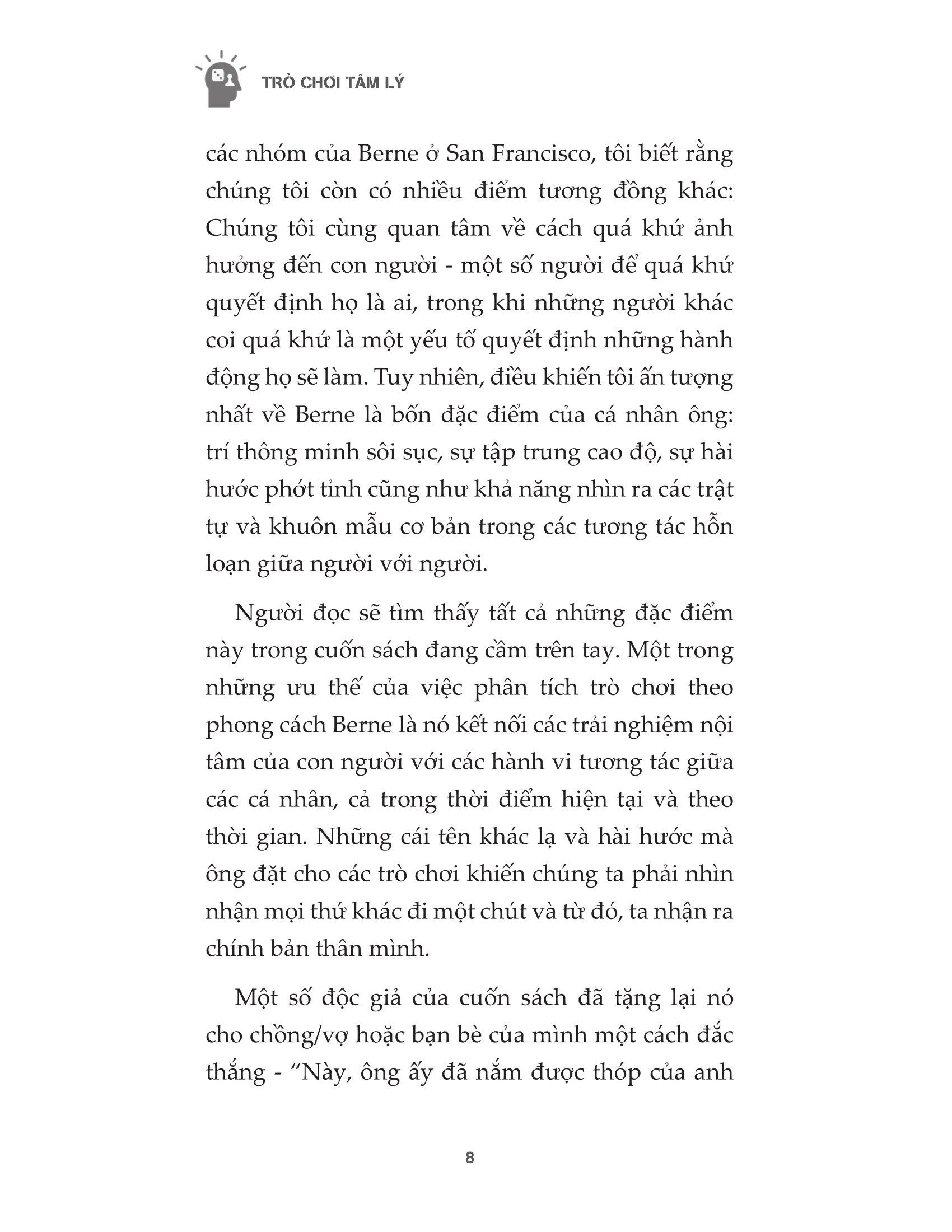 Trong cuốn sách này, bác sĩ tâm lý Eric Berne sẽ tiết lộ tâm lý đằng sau những tương tác của chúng ta với những người xung quanh đồng thời vạch trần những thủ đoạn vô thức quen thuộc mà mỗi người chúng ta làm để đạt được điều m.ình muốn từ người khác. Bất kể loại trò chơi nào chúng ta đang chơi, nó thường mang tính thao túng và chúng ta thậm chí không nhận ra m.ình đang chơi. Bạn sẽ nhớ lại những trò chơi kinh điển như trận chiến giữa các cặp đôi chết người “If it Wen’t For You” hoặc những trò chơi tán tỉnh như “Let's You and Him Fight”.