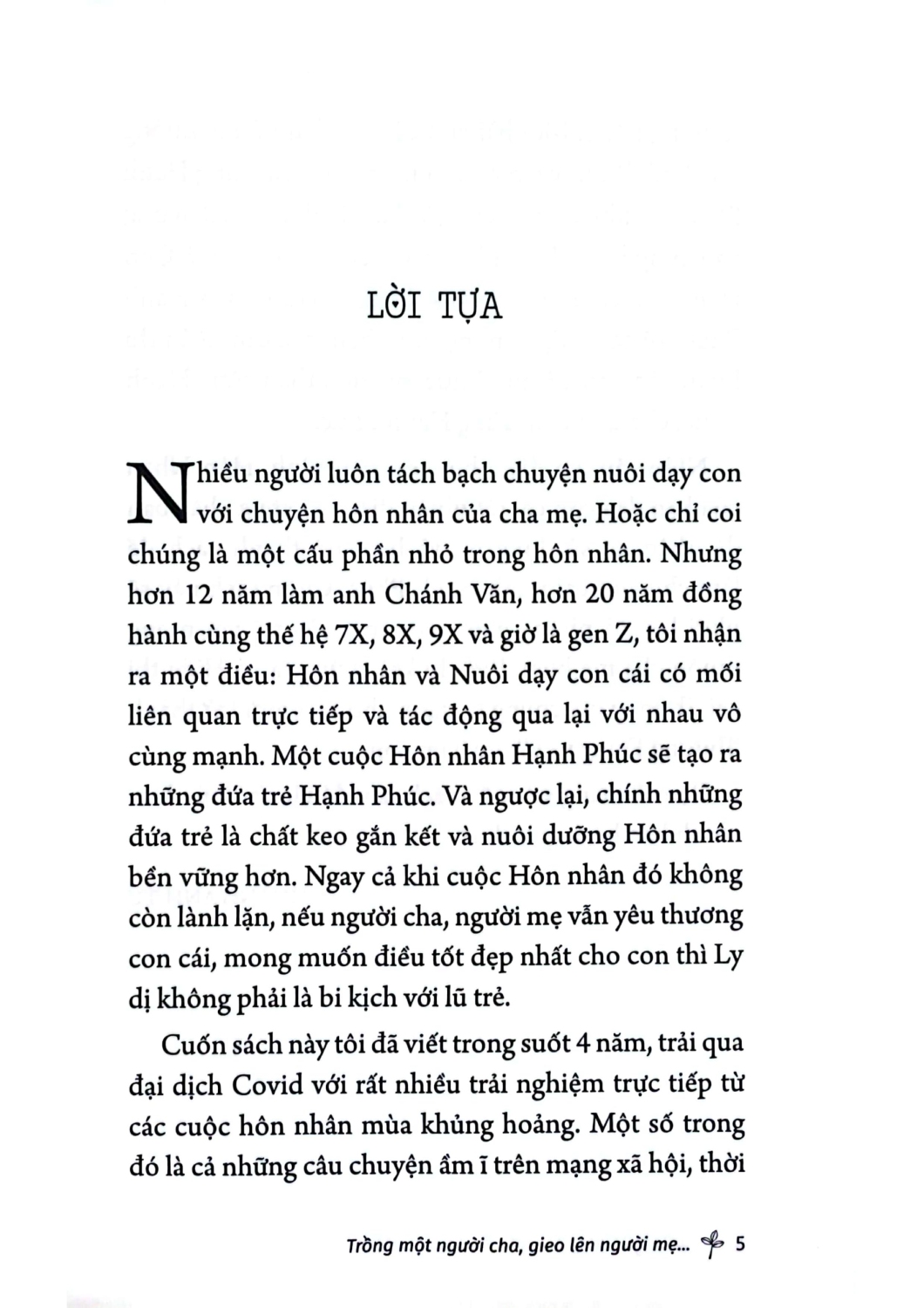 Cuốn sách Trồng Một Người Cha Gieo Lên Người Mẹ Và Đổ Đầy Hạnh Phúc Vào Những Đứa Trẻ nói về mối liên hệ sâu sắc giữa hôn nhân và vai trò của cha mẹ trong việc nuôi dưỡng con cái. Tác phẩm nhấn mạnh rằng một hôn nhân hạnh phúc không chỉ mang lại niềm vui cho bản thân mà còn là nền tảng vững chắc để xây dựng những đứa trẻ hạnh phúc. Ngược lại, những đứa trẻ là những trái tim liên kết, nuôi dưỡng hơn bất cứ điều gì trong hôn nhân.