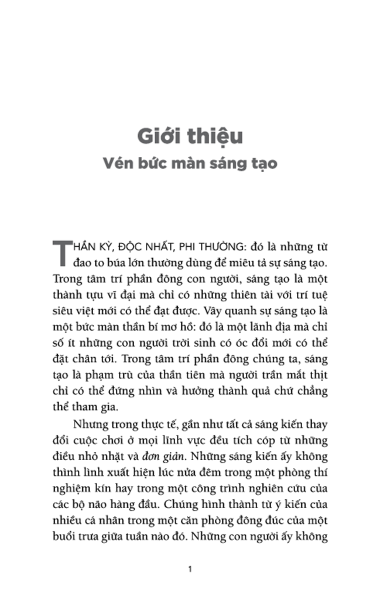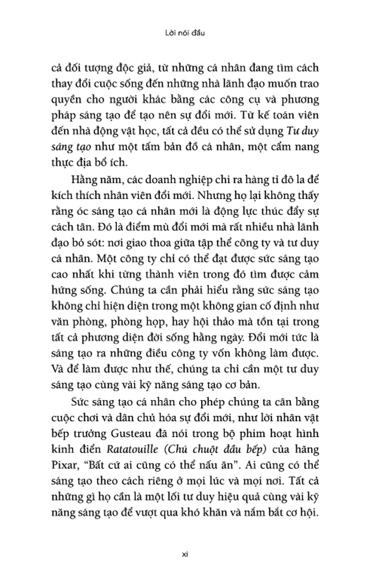 Nếu bạn là một thiên tài với óc sáng tạo phi thường thì xin chúc mừng; quyển sách này không dành cho bạn. Nhưng nếu bạn không phải là thiên tài như thế thì có lẽ đây là quyển sách bạn cần đấy. Tư Duy Sáng Tạo: Làm Chủ 6 Kỹ Năng Khơi Nguồn Đổi Mới phù hợp với tất cả đối tượng độc giả, từ những cá nhân đang tìm cách thay đổi cuộc sống đến những nhà lãnh đạo muốn truyền năng lượng cho người khác bằng các công cụ và phương pháp sáng tạo để tạo nên sự đổi mới. Tất cả chúng ta đều có thể học cách trở nên sáng tạo. Từ kế toán đến nhà động vật học, tất cả đều có thể sử dụng "Tư duy sáng tạo" như một tấm bản đồ cá nhân, một cẩm nang thực địa bổ ích.