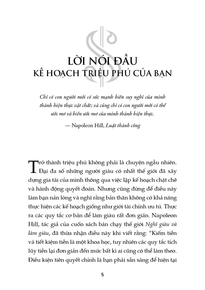 Trong cuốn sách này, tác giả đã tiết lộ lý do tại sao một số người thành công trong việc đảm bảo tài chính, trong khi số khác bị cản trở bởi những thói quen của chính bản thân họ. Thông qua những câu chuyện minh họa phương pháp chính xác mà các cá nhân sử dụng để xây dựng tài sản của bản thân, tác giả đã đưa ra 9 quy tắc cơ bản giúp mọi người hiện thực hóa ước mơ trở thành triệu phú. Những quy tắc đó bao gồm: