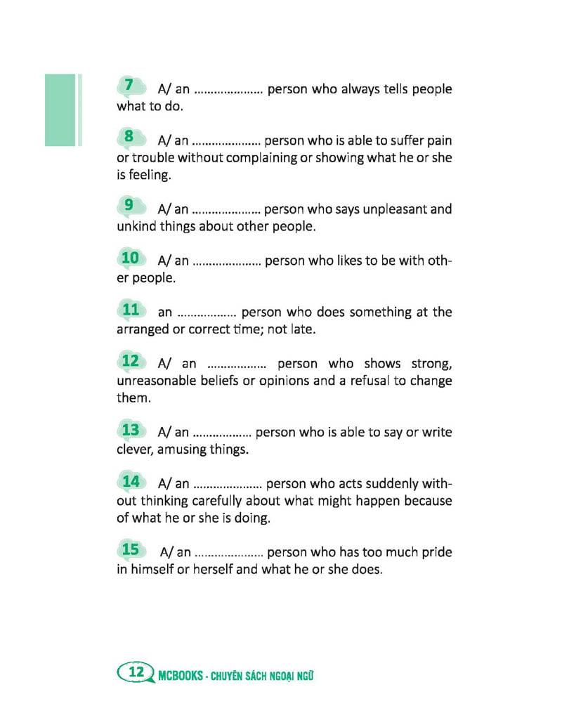 Quyển sách này cung cấp cho bạn 250 bài tập thiết thực, hữu ích để mở rộng vốn từ vựng một cách nhanh chóng và hiệu quả. Các bài tập được sắp xếp theo chủ