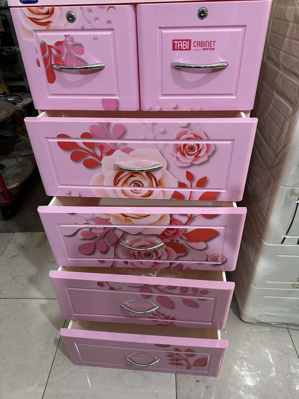 Các họa tiết trên tủ được in vi tính trực tiếp lên nhựa được tính toán tỉ lệ và có độ đồng đều trên các mặt của mỗi tầng tạo cho mỗi chiếc tủ tabi như một khung tranh với những chi tiết vô cùng tuyệt đẹp.