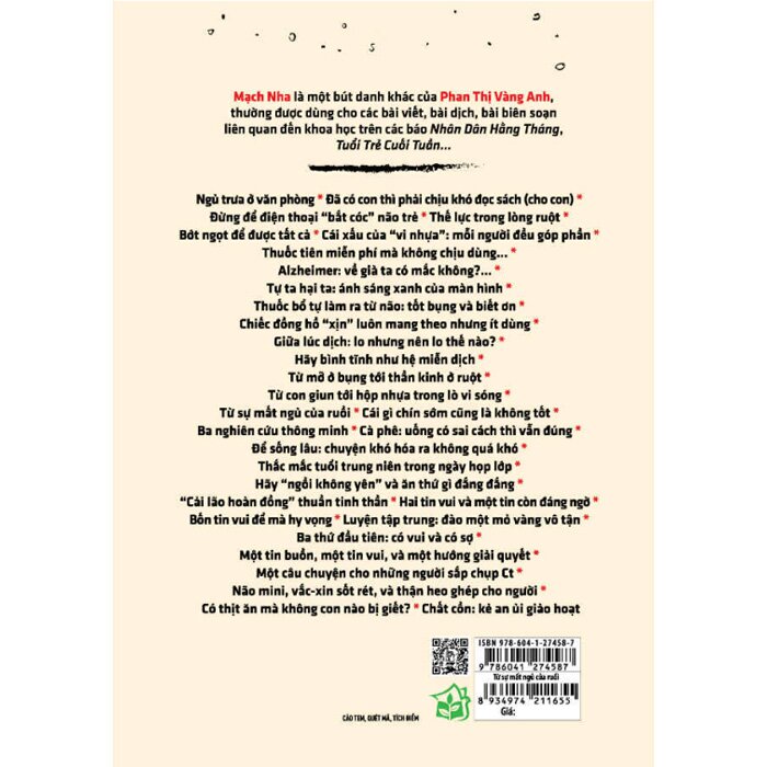Từ Sự Mất Ngủ Của Ruồi Cuộc sống luôn ở phía trước, con người vốn bận rộn, ít khi nhìn lại mình và thường đổ lỗi cho việc không có thời gian để nhìn lại mình. Đến một ngày, sao thấy mình hay khó ngủ, ruột có vấn đề, lớp mỡ ở bụng là rào cản... Giật mình nhìn lại, ngẫm ra chính ta chứ không ai khác đã đối xử bất công, hay nặng nề hơn là ngược đãi bản thân ta nhiều nhất. Ba mươi chủ đề đặt ra trong cuốn sách Từ sự mất ngủ của ruồi chỉ xoay quanh chuyện con người, gần gũi, thiết thực và không khó thực hiện để có một cuộc sống thú vị, tích cực; thế nhưng không phải muốn là được mà phải tập thành nếp, thói quen.