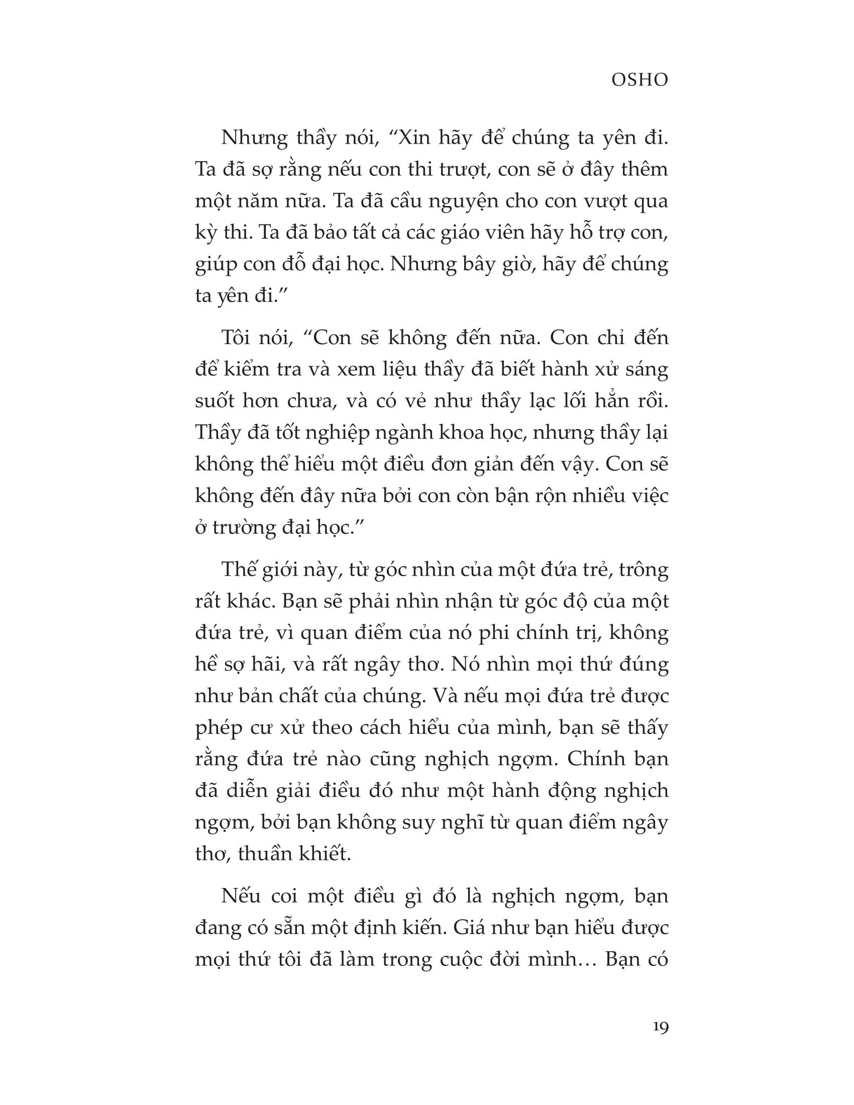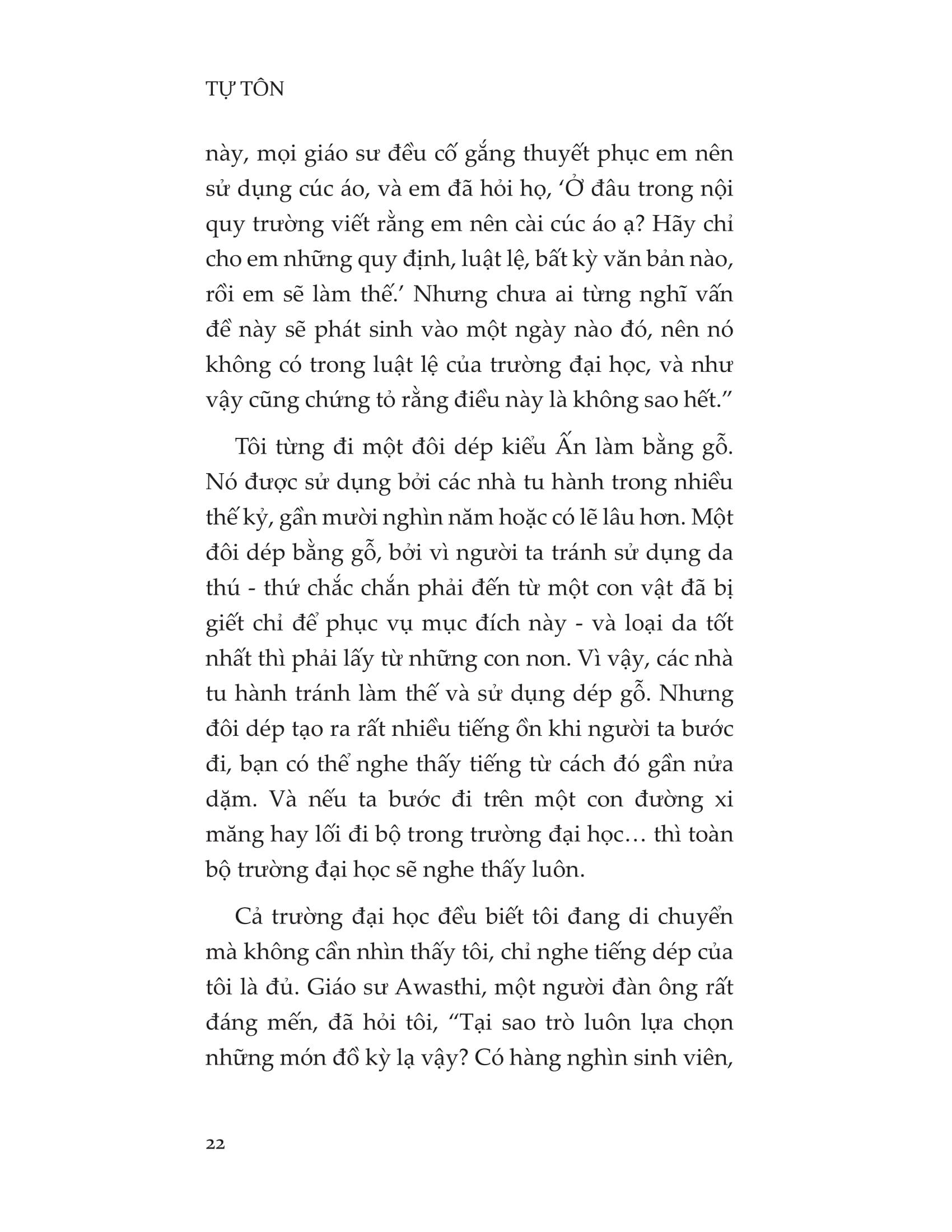 Tự Tôn Tự tôn là cuốn sách dẫn đường giúp những linh hồn đang lạc lối tìm lại được điều quan trọng nhất: bản thể chân thật của chính mình. Khi học được cách tôn trọng bản thân đúng nghĩa, chúng ta sẽ thoát khỏi mọi gông cùm về tư tưởng để tự do tung cánh, được bộc lộ trọn vẹn tính cách và năng lượng cá nhân, cũng như sống hòa hợp với tập thể, thanh thản trước mọi thăng trầm của cuộc đời. Mỗi chúng ta đều được sinh ra với một cái tôi độc nhất, thuần khiết và mạnh mẽ. Nhưng trong quá trình trưởng thành, chúng ta vô tình quên mất bản tính này và phải đeo lên những lớp mặt nạ do sức ép của xã hội, các quan điểm lạc hậu và những định kiến sai trái. Trong cuốn sách này, Osho giúp chúng ta định nghĩa lại con người mình. Đối với hầu hết mọi người, từ khi ta đủ lớn để biết đi, nhiều bài giảng tôn giáo và đạo đức đã được sử dụng để định hình hành vi của chúng ta - một con người nhỏ bé trong thế giới của rất nhiều con người khác. Osho nói rằng, nếu như chúng ta còn mang gánh nặng của những quan điểm và những điều mê tín dị đoan bị áp đặt lên bản thân này, thì ta thậm chí không thể bắt đầu một cuộc tìm kiếm trung thực để khám phá xem ta thực sự là ai. Một khi ta còn chưa biết mình là ai, sự tự tôn mà ta đang có hiện nay sẽ chỉ là một thứ được xây trên nền móng thiếu vững chắc, dễ dàng đổ sụp ngay vào khoảnh khắc một niềm tin nào đó mà chúng ta trân quý bị đặt dấu hỏi. Khi trả lời các câu hỏi của người lắng nghe thuyết giảng, Osho làm sáng tỏ sự thật rằng, những trải nghiệm của chúng ta trong cuộc sống hằng ngày bị tác động rất nhiều bởi các điều kiện tôn giáo và xã hội - và chúng ta thậm chí không nhận thức được thực tế này. Chúng ta liên tục bị kéo ra khỏi bản tính độc nhất mà mỗi chúng ta sở hữu khi mới sinh ra. Thay cho bản chất nguyên thể và độc nhất đó, một bản thể giả tạo đã được xây dựng. Cái tôi giả dối cuối cùng giành lấy quyền kiểm soát tâm trí chúng ta, tác động đến suy nghĩ của ta về sự thành công, về những mối quan hệ, cũng như về việc bản thân ta là ai. Trong Tự tôn, Osho giới thiệu đến độc giả ba yếu tố trụ cột: sự quan sát, sự nhận thức và sự tỉnh táo. Đây là chìa khóa để khám phá lại bản chất độc nhất của chúng ta, “cái tôi” chân thực nằm trong tất cả chúng ta. Và một khi ta tiến bước trên hành trình khám phá, thì mọi lẽ sai lầm mà chúng ta vẫn luôn mang theo người từ trước đến nay sẽ đơn giản là biến mất. Những bài thuyết giảng của Osho hướng tới cộng đồng những người hành thiền, những người sống và hợp tác nỗ lực nhằm đưa thiền định vào trung tâm của cuộc sống thường nhật. Các nội dung trong sách chỉ ra con đường hướng tới một lối sống chân thật, cân bằng giữa nhu cầu bộc lộ bản thân và nhu cầu sống hòa hợp cùng tập thể. Về tác giả Osho (1931-1990) là một đạo sư người Ấn được hàng triệu người trên thế giới tìm đọc. Hàng trăm cuốn sách cùng vô số bài thuyết giảng của ông về đề tài tâm linh đã để lại những dấu ấn khó phai trong lòng công chúng. Giáo lý của Osho đậm chất phương Đông, nhấn mạnh tới tầm quan trọng của thiền và sự tỉnh thức, từ đó hướng người tu tập buông bỏ cái tôi, nuôi dưỡng tình thương yêu và đánh thức nguồn năng lượng nguyên thủy từ trong căn cốt.