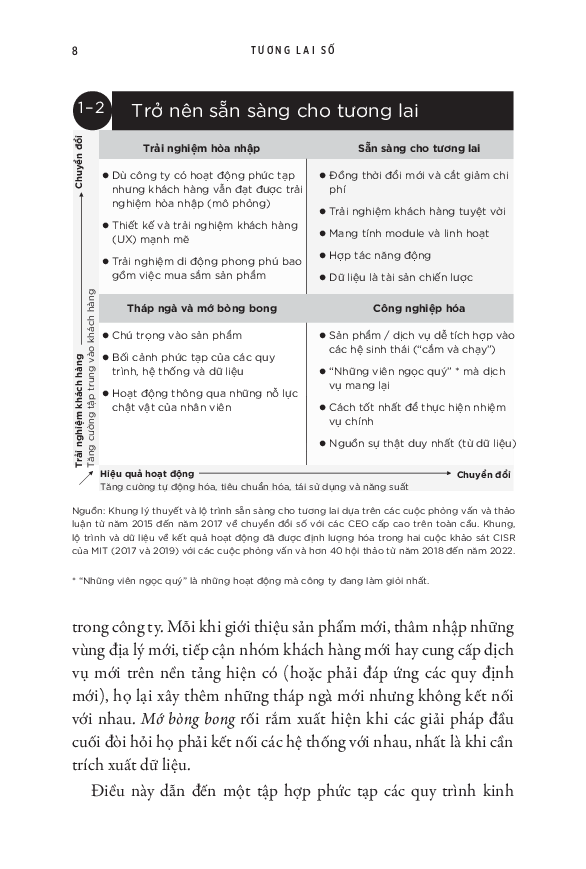 Tác giả bắt đầu bằng việc định nghĩa một công ty sẵn sàng cho tương lai số, bao gồm cả những khía cạnh "mềm" như xây dựng tầm nhìn rõ ràng, ngôn ngữ nội bộ chung và văn hoá doanh nghiệp cho đến những thay đổi "cứng" về nền tảng công nghệ. Bốn lộ trình đưa doanh nghiệp đến tương lai số bao gồm: