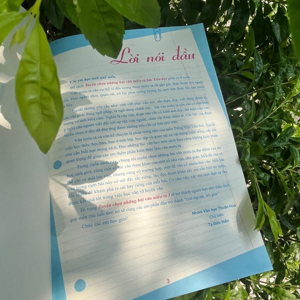Bộ sách Tuyển chọn những bài văn miêu tả gồm có 4 cuốn. Từ lớp 2 đến lớp 5.Cuốn sách được sắp xếp như sau:A - Văn miêu tả cây cối, hoa trái.B - Văn miêu tả loài vật, đồ vật.C - Văn miêu tả người.D - Văn miêu tả phong cảnh, cảnh vật.Văn miêu tả cần cụ thể. Đối tượng được miêu tả rất gần gũi, thân thuộc với người viết. Không nên viết chung chung mà nên viết cụ thể; có thế thì bài văn mới hay, mới hấp dẫn, đọc lên nghe mới thú vị.Phải ngắm nhìn, quan sát, có lúc phải tưởng tượng, phải sắp xếp chi tiết, bộ phận của sự vật thì mới làm đựoc bài văn miêu tả đặc sắc, hay, được điểm cao.Ngoài những yêu cầu như: chữ viết phải nắm nót, cẩn thận, đẹp, viết đúng chính tả; câu văn phải đúng ngữ pháp, từ ngữ dùng chính xác,ì bài văn miêu tả còn cần có tính hình tượng và tính biểu cảm. Nghĩa là câu văn, đoạn văn cần có hình ảnh đẹp, thể hiện cảm xúc, ý nghĩa của người viết đối với sự vật, con người, cảnh vật được miêu tả. Các bài văn được tuyển chọn ở đây đã đáp ứng những yêu cầu cơ bản được nêu lên.Văn miêu tả và văn kể chuyện là phần trọng tâm của môn Tiếng Việt Tiểu học. Ngoài việc học thầy, học bạn, học ở trên lớp, học tập và quan sát sự vật trong cuộc sống, các em còn cần biết học trong sách và làm theo sách. Đọc những bài văn hay trên sách báo cũng không kém phần quan trọng. Có biết tự đọc, tự học mới thành tài.