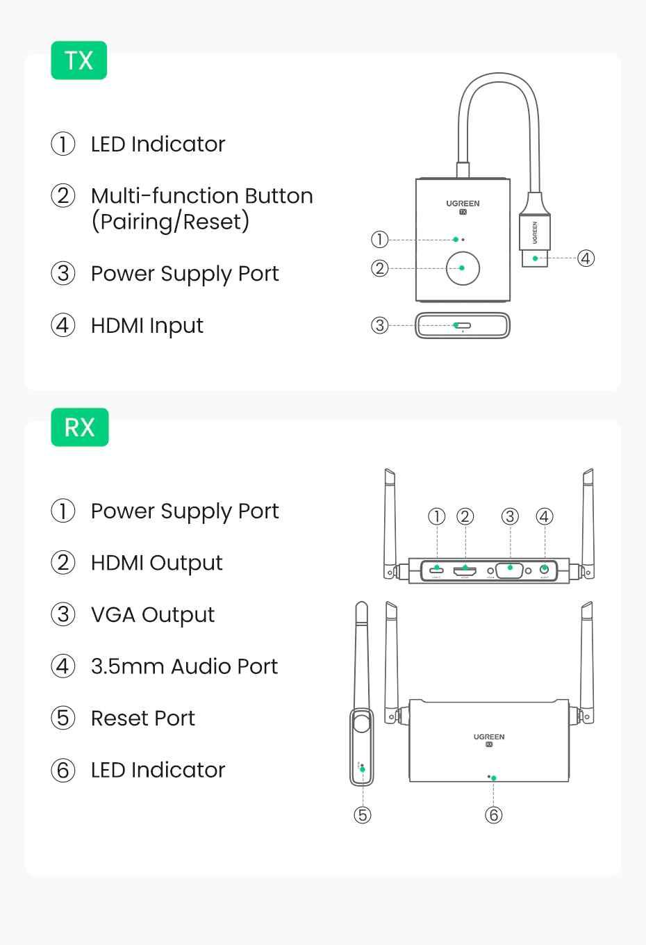 1. Brand: UGREEN 2. Code: 50633a - CM506 3. Transmitter: 1 × HDMI, 1 × USB-C 4. Transceiver: 1 × HDMI, 1 × VGA, 1 × USB-C, 1 power supply × 3.5mm Audio 5. Resolution: