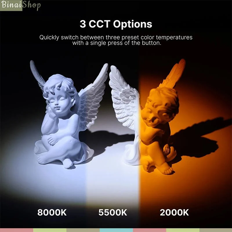 Dải nhiệt rộng 2000-8000K, kiểm soát độ sáng từ 0% - 100% theo 4 mức khác nhau, CRI 90+ cao cho màu sắc bão hoà gần màu gốc hơn.