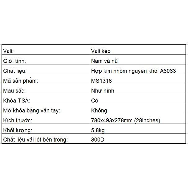 Vali hợp kim nhôm được làm từ nhôm nguyên chất kết hợp với: Silic, đồng, ạo ra sản phẩm có đặc tính vật lý trọng lượng nhẹ, độ cứng, đàn hồi, chống ăn mòn tốt.