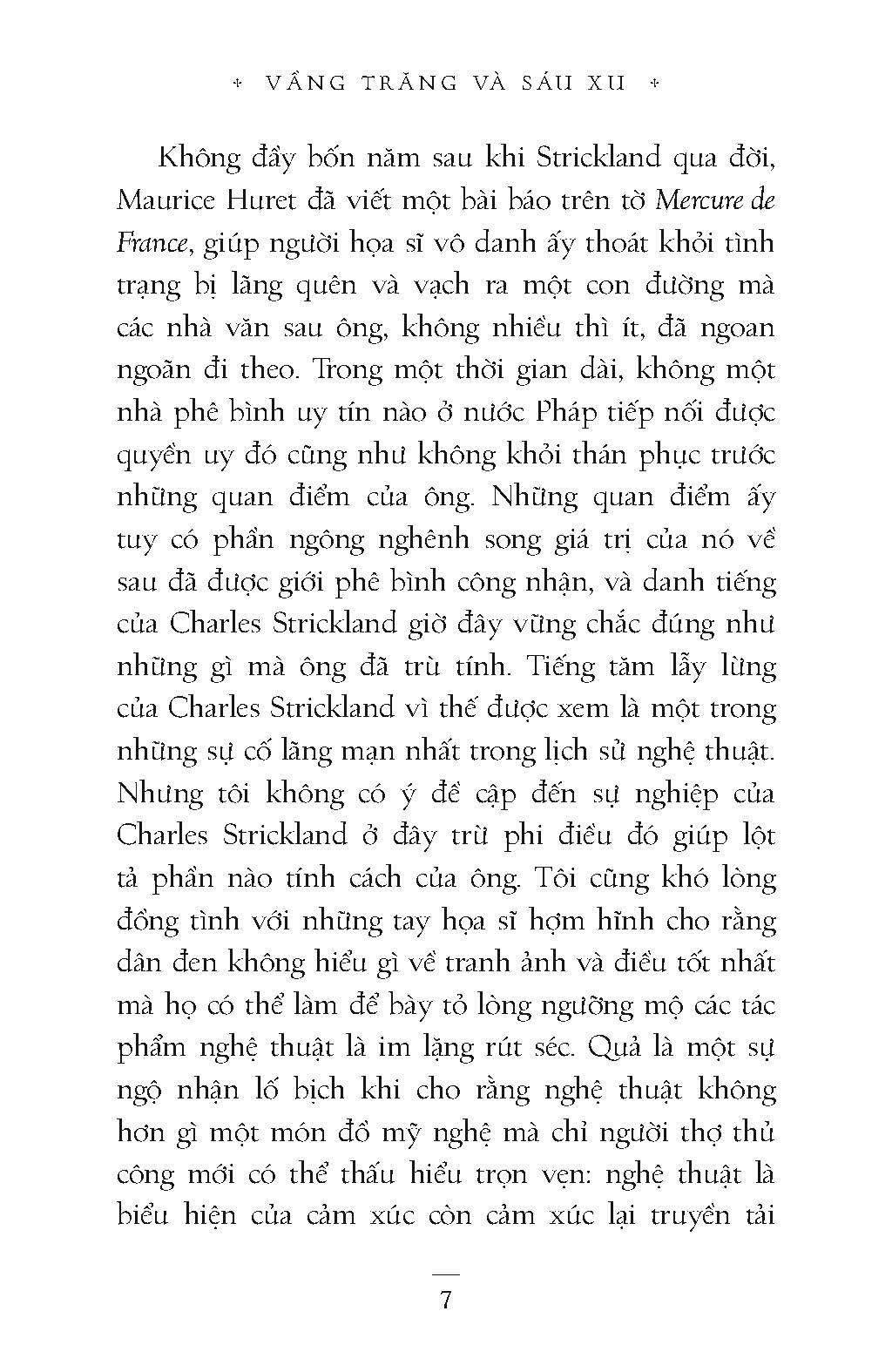 Vầng trăng và sáu xu” kể về cuộc đời của Charles Strickland, một nhà môi giới chứng khoán trung lưu có vợ đẹp con khôn, sự nghiệp vững vàng cùng một cuộc đời được trọng vọng ngưỡng mộ. Nhưng điều không ai ngờ tới là người đàn ông trung niên ít nói và có phần lập dị này lại đột ngột từ bỏ tất cả cũng như chấp nhận đối mặt với sự gièm pha, điều tiếng chỉ vì giấc mộng vẽ vời mù mịt. Tại một xưởng vẽ tồi tàn ở Paris, Strickland dồn toàn bộ sức lực và thời gian của mình vào việc vẽ tranh, tuy nhiên ông luôn từ chối bán buôn hay thậm chí là trưng bày tác phẩm của mình dù luôn phải sống trong cảnh cơ hàn thiếu thốn. Trong cơn túng quẫn bởi sự nghèo đói, cùng bản tính ngoan cố muốn lần tìm đến tận cùng khát khao của bản ngã, Strickland cập bến Tahiti, nơi ông miệt mài sáng tác các tác phẩm nghệ thuật phi thường cho đến ngày qua đời vì chứng bệnh phong khiến ông mù cả hai mắt; để lại một di sản nghệ thuật vĩ đại cùng những nỗi trăn trở hoài nghi về sự mâu thuẫn giữa nghệ thuật và nhân sinh, giữa trần tục thực tế và lý tưởng của con người. Lấy cảm hứng từ cuộc đời của danh họa Paul Gauguin, “Vầng trăng và sáu xu” là câu chuyện về phận người bị thôi thúc đến mức ám ảnh bởi nhu cầu sáng tạo - bất kể cái giá khắc nghiệt phải trả cho chính mình và những người xung quanh.