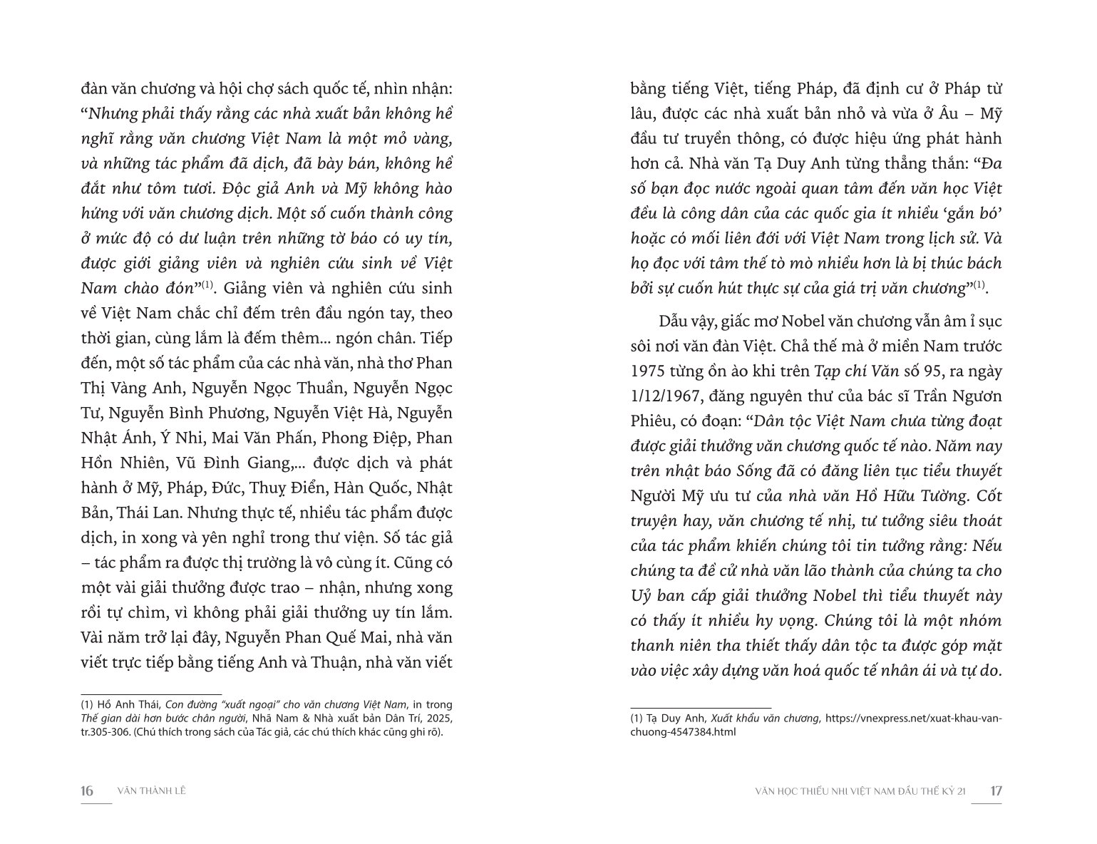 “Bản chất của văn học là ký ức. Văn học chính là cái còn đọng lại trong con mắt nhắm”. Nhà văn Nguyễn Bình Phương có lần từng nói vậy. Và tôi cũng thử nhắm mắt lại, trong tĩnh lặng nghĩ suy, không phải để trừu tượng đi tìm ký ức cho những trang văn của riêng mình, mà thực tế hơn, cụ thể hơn, rõ ràng hơn, xem văn học thiếu nhi hai lăm năm qua hiện lên như thế nào và còn đọng lại những gì, trong tôi. Tự nhận là người có sáng tác văn học thiếu nhi, tham gia làm sách thiếu nhi, và hơn hết là yêu con trẻ, tôi kỳ vọng mình có cái nhìn phần nào bao quát, hệ thống được sự chuyển động của văn học thiếu nhi những năm qua.” – Văn Thành Lê