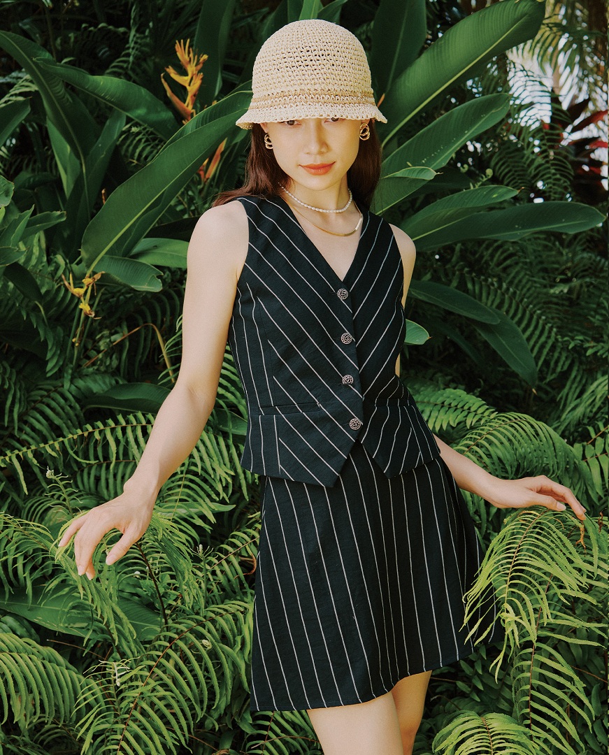 - Họa tiết sọc kinh điển: Họa tiết sọc dọc mảnh trên nền vải đen không chỉ tạo hiệu ứng thị giác thon gọn mà còn là một chi tiết đặc trưng của thời trang retro, mang đến vẻ ngoài cá tính, không bao giờ lỗi mốt và dễ dàng gợi nhớ đến những biểu tượng phong cách xưa. Họa tiết này tiếp tục được sử dụng đồng bộ trên cả áo gile và chân váy, tạo nên một tổng thể hài hòa, đậm chất vintage.