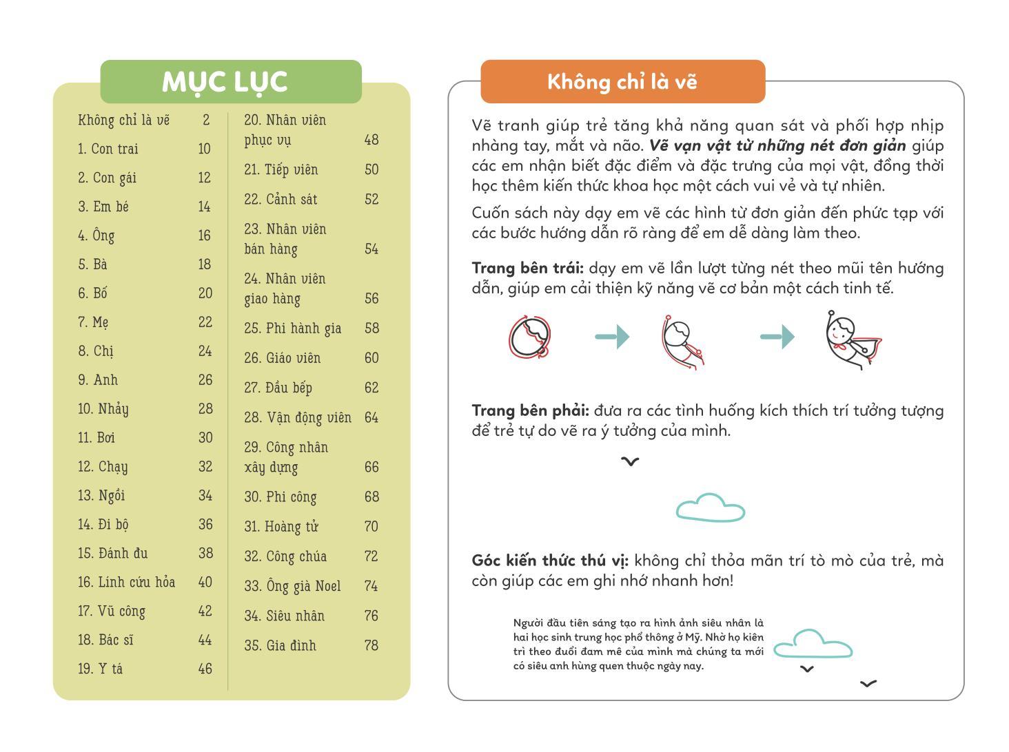 Bên cạnh các bước hướng dẫn mạch lạc giúp em dễ dàng vẽ theo, mỗi cuốn sách cũng đưa ra các tình huống kích thích trí tưởng tượng để em thỏa sức sáng tạo bức tranh của riêng mình. Sách tích hợp thêm từ vựng tiếng Anh, kiến thức khoa học và thông tin bên lề thú vị giúp em khám phá thêm nhiều điều hữu ích. Vẽ vạn vật từ những nét đơn giản sẽ mang tới cho bạn nhỏ một hành trình học vẽ thật vui và ý nghĩa!