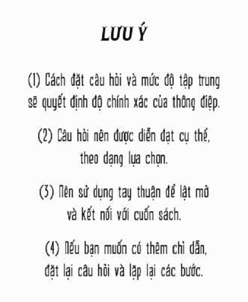 Không có gì là ngẫu nhiên. Mọi chuyện đều là tất nhiên. Một cuốn sách tâm linh giúp bạn giải quyết những vấn đề trong cuộc sống, công việc, tình cảm… Nếu bạn đang phân vân trước những lựa chọn, nếu bạn đang thiếu quyết đoán, nếu bạn không biết tiếp theo nên làm gì: hãy đặt một câu hỏi. Và hãy để những vị thần quyết định thay bạn. Hai phiên bản để lựa chọn: bìa đen và bìa hồng Ngôn ngữ: tiếng Việt & tiếng Anh *Hướng dẫn sử dụng cuốn sách: (1) Đặt tay lên bìa cuốn sách. (2) Nhắm mắt, hoàn toàn tập trung vào điều bạn muốn hỏi. (3) Đặt một câu hỏi (nói to hoặc hình dung câu hỏi trong đầu), tay vuốt theo mép của các trang sách. (4) Khi trực giác mách bảo thời điểm thích hợp, hãy mở sách ra và bạn sẽ có câu trả lời. (5) Lặp lại quy trình cho các câu hỏi khác.
