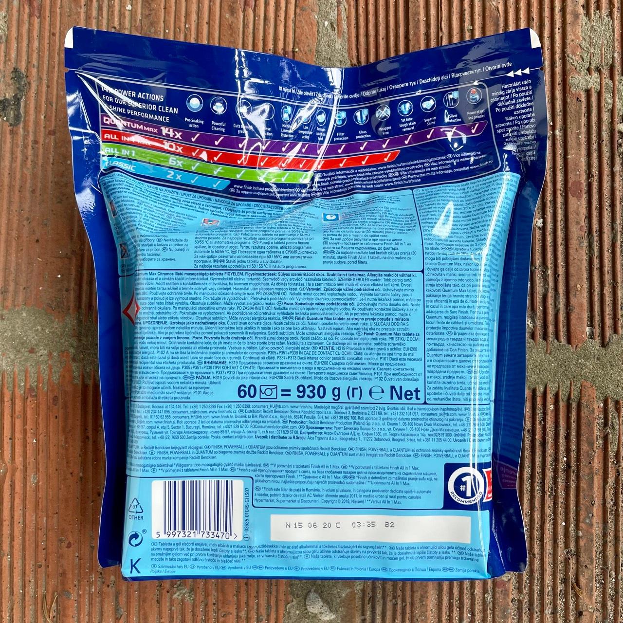 Túi 94 viên rửa chén Finish All In 1 Max Dishwasher Tablets (là viên rửa chén cao cấp chuyên dùng cho máy rửa chén). Xuất xứ: Ba Lan (EU) - Nhà sản xuất: Reckitt Benckiser