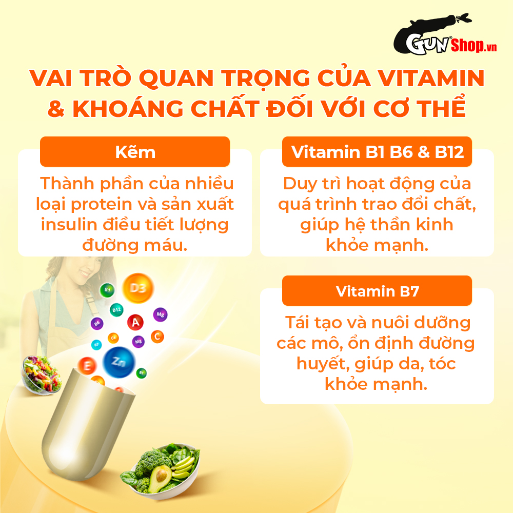 Đặc điểm: Bổ sung 8 loại vitamin và 3 khoáng chất để cơ thể khoẻ mạnh, hỗ trợ tăng cường hệ miễn dịch, tăng cường sức đề kháng và nâng cao sức khỏe tổng thể. Tái tạo tế bào và tăng khả năng hấp thụ, cải thiện tình trạng mệt mỏi.
