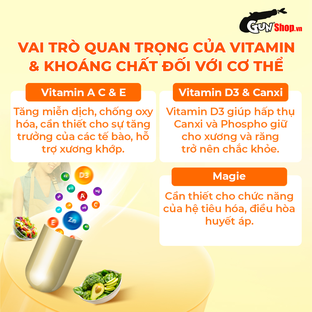 Bổ sung: Vitamin A, C, E, D3, B1, B6, B7, B12, Canxi, Magie, Kẽm.