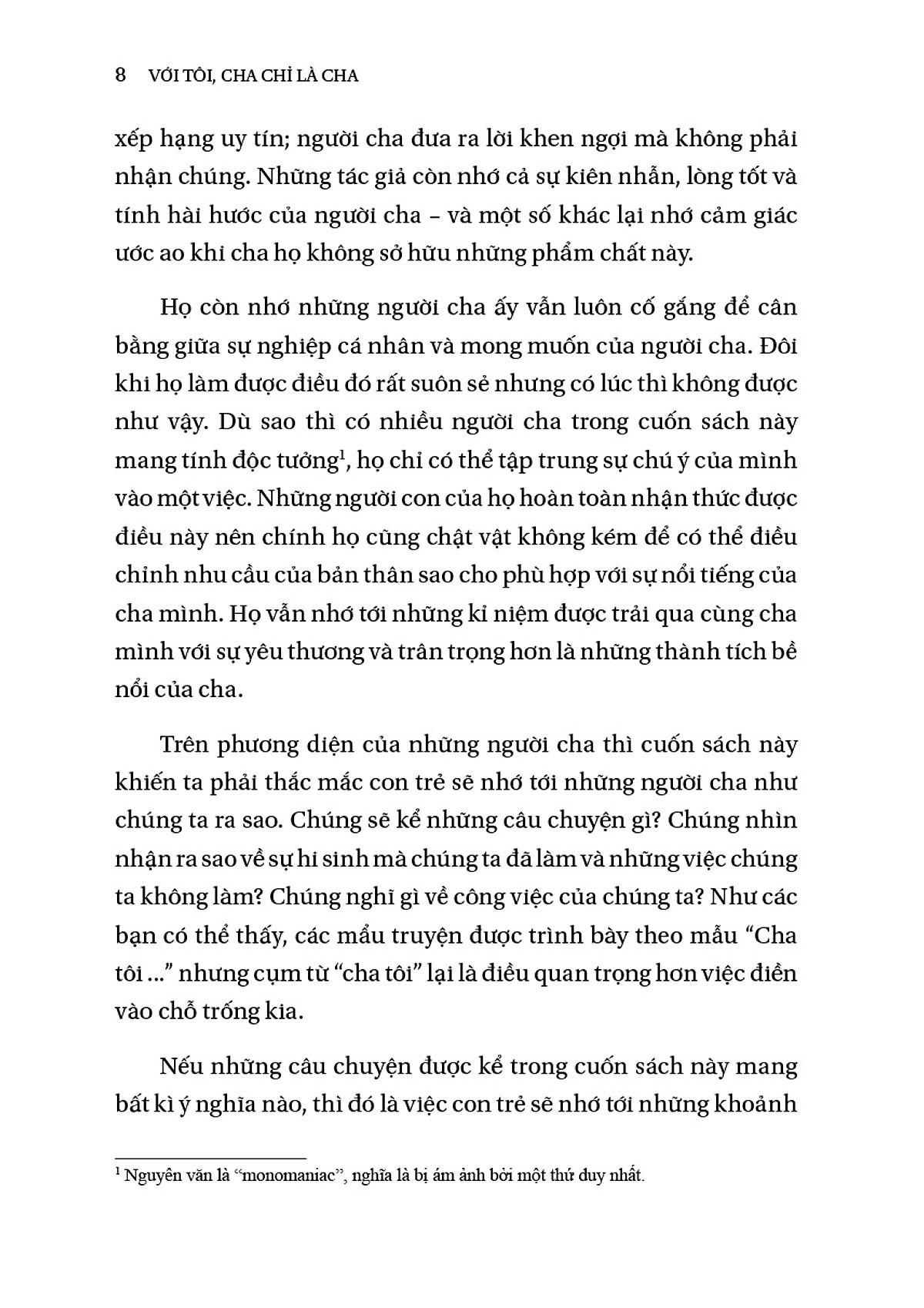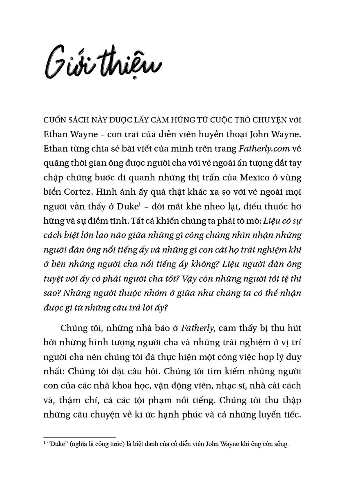 Bộ sưu tập những câu chuyện cảm động về người cha, qua góc nhìn của những người con, đã mang đến 40 câu chuyện kể xúc động, ngạc nhiên, riêng tư và chân thật về những nhân vật nổi tiếng nhưng trong vai trò là một người cha, đã mang đến cho chúng ta những ý tưởng mới mẻ mà sâu sắc về hai từ “người cha”, đồng thời khiến chúng ta càng thêm trân quý những người nghệ sĩ.