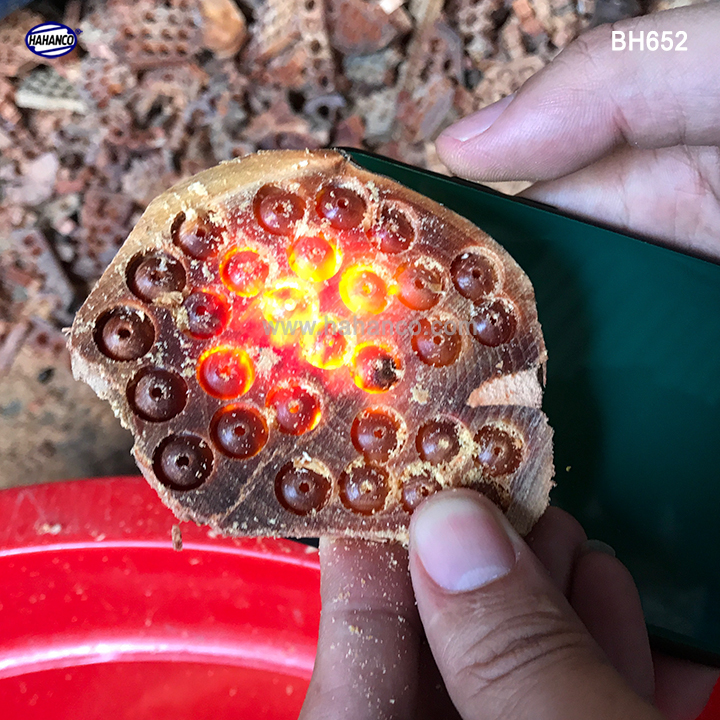 -> Gỗ Huyết Long có màu vàng nâu đất khi rọi đèn vào có màu máu đỏ .