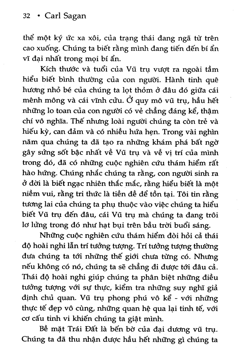 “Carl Sagan là một trong số những nhà khoa học xuất sắc nhất của thời đại chúng ta… Ông đã làm công việc viết lách cừ khôi khi đào sâu vào quá khứ, hiện tại và tương lai của khoa học, trong việc xử lý sự bao la gây choáng váng trí óc của cái vũ trụ mà trong đó chúng ta đang tồn tại.”