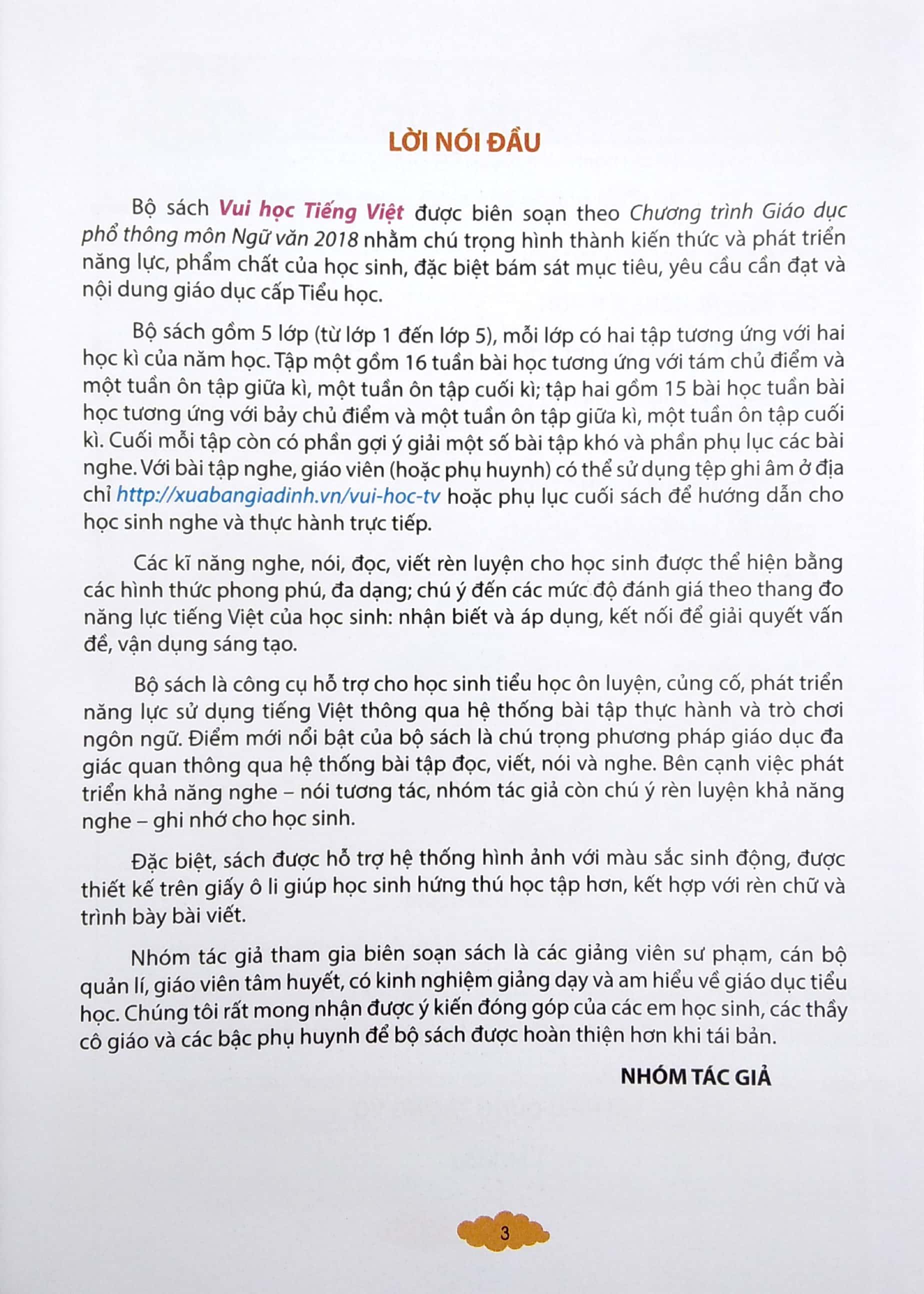 Bộ sách Vui học Tiếng Việt được biên soạn theo Chương trình Giáo dục phổ thông môn Ngữ văn 2018 nhằm chú trọng hình thành kiến thức và phát triển năng lực, phẩm chất của học sinh, đặc biệt bám sát mục tiêu, yêu cầu cần đạt và nội dung giáo dục cấp Tiểu học.