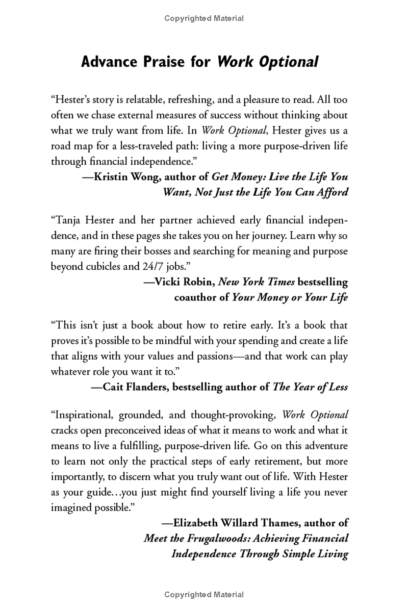 Tanja Hester and her husband Mark left their crazed careerist lifestyle to live their dream life in Lake Tahoe, retiring early from high-stress careers. Now Tanja will help you map out a customized plan for freedom and make it easy to succeed, whether you're good at math and budgeting -- or not! Work Optional is more than just a financial plan: it's a plan for your whole life -- designed by you, not by an employer or clients. Tanja walks you through envisioning your dream life, accounting for variables such as health care and children, protecting yourself from recessions and future unknowns, and achieving a purpose-filled early retirement, semi-retirement, or career intermission with completely doable, non-penny-pinching steps.