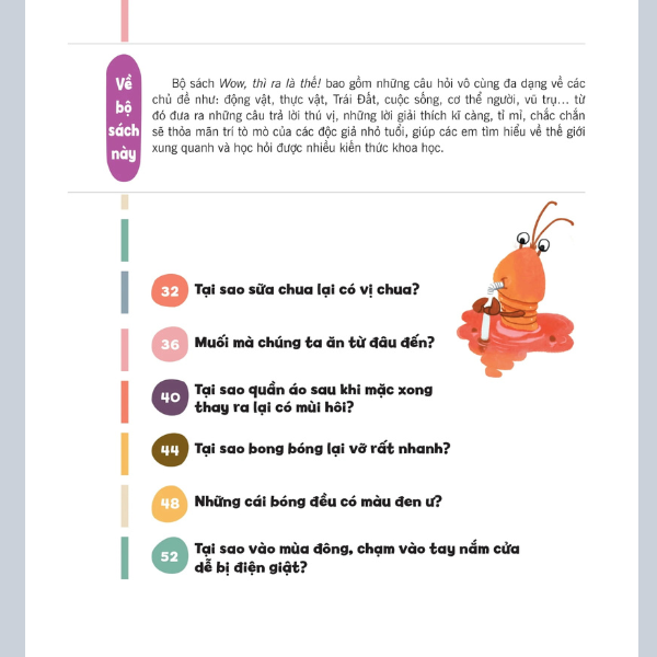 Wow, thì ra là thế! mang đến những lời giải đáp thú vị và bất ngờ như tên gọi của nó. Bộ sách với 9 chủ đề gây tò mò, mỗi tập truyện là rất nhiều câu hỏi, kèm với câu đố vui và giải thích chi tiết khoa học: