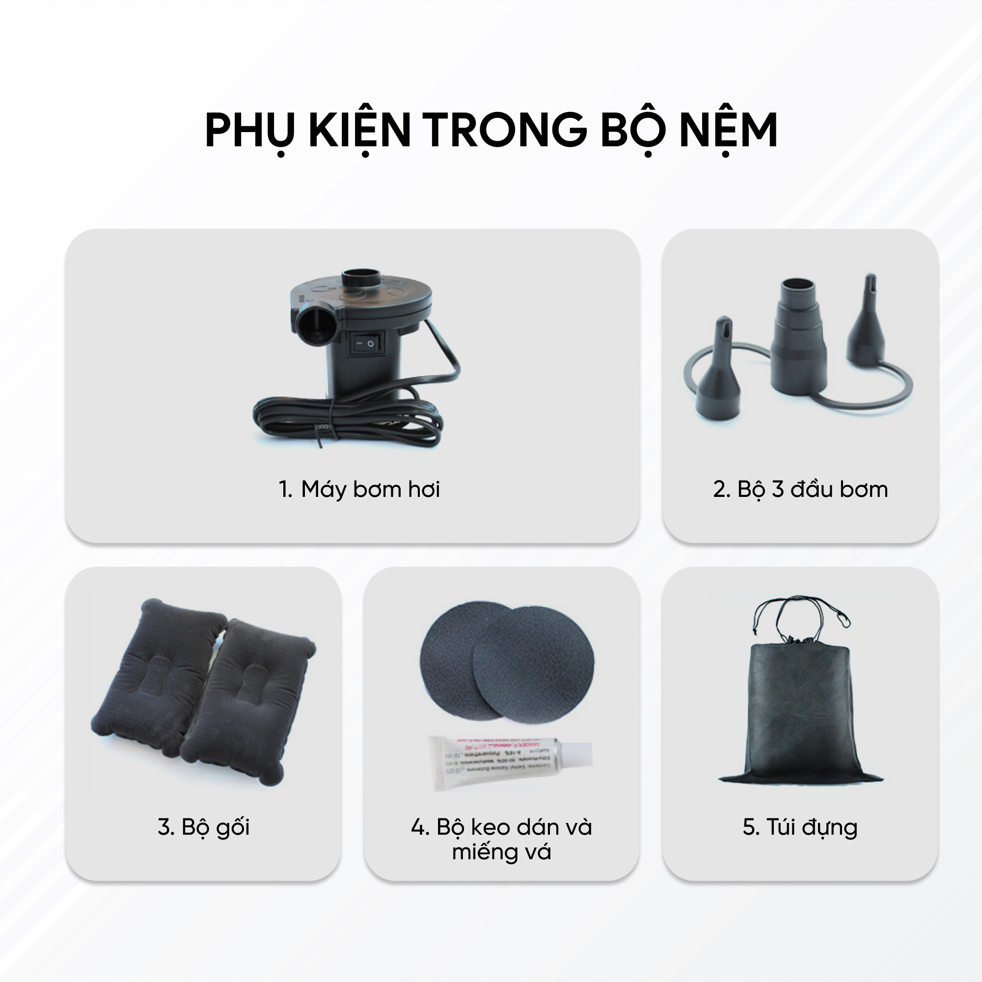 - Đệm đi kèm với bơm hơi 12V cắm trong xe, giúp bạn dễ dàng thổi nệm lên chỉ trong vài phút.