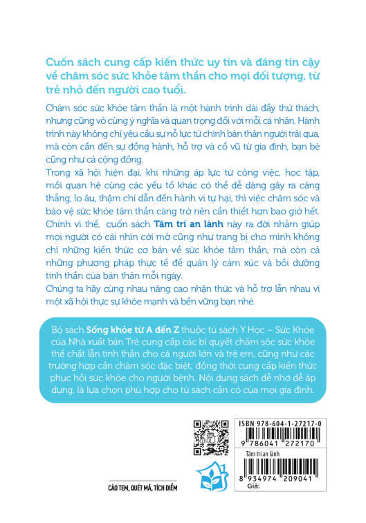 Chăm sóc sức khỏe tâm thần là một hành trình dài đầy thử thách, nhưng cũng vô cùng ý nghĩa và quan trọng đối với mỗi cá nhân. Hành trình này không chỉ yêu cầu sự nỗ lực từ chính bản thân người trải qua, mà còn cần đến sự đồng hành, hỗ trợ và cổ vũ từ gia đình, bạn bè và cả cộng đồng. Trong xã hội hiện đại, khi mà những áp lực từ công việc, học hành, mối quan hệ và các yếu tố khác có thể dễ dàng gây ra căng thẳng và lo âu, dẫn đến các rối loạn tâm thần như rối loạn lo âu, trầm cảm, rối loạn ám ảnh – cưỡng bức, v.v. thì việc chăm sóc cũng như bảo vệ sức khỏe tâm thần càng trở nên cần thiết hơn bao giờ hết. Chính vì thế, Nhà xuất bản Trẻ đã phối hợp cùng Thạc sĩ Tâm lý học Nguyễn Võ Huệ Anh thực hiện cuốn sách “Tâm trí an lành” thuộc bộ sách “Sống khỏe từ A đến Z”, nhằm giúp mọi người có cái nhìn cởi mở cũng như trang bị cho mình không chỉ những kiến thức cơ bản về sức khỏe tâm thần, mà còn cả những phương pháp thực tế để quản lý và nâng cao tinh thần của bản thân mỗi ngày. Chúng ta hãy cùng nhau nâng cao ý thức và hỗ trợ lẫn nhau vì một xã hội thực sự khỏe mạnh và bền vững.