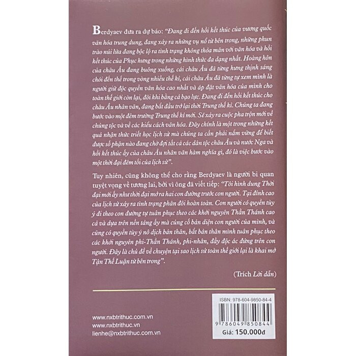 Nikolay Berdyaev (1874 - 1948): triết gia Nga nổi tiếng của thế kỉ XX. Năm 1922, ông cùng nhiều trí thức và những người hoạt động văn hóa nổi tiếng khác bị trục xuất khỏi nước Nga Xô viết. Sau khi bị trục xuất, ông sống ở Đức rồi định cư tại Pháp.Ông cùng S.L.Frank và S.N.Bulgakov đặt cơ sở cho sự phục hưng nền triết học tôn giáo Nga. Ông đã xây dựng triết học về bản diện cá nhân và tự do trong tinh thần của chủ nghĩa hiện sinh. Nikolay Berdyaev được xem là người có ảnh hưởng lớn đến sự phát triển của chủ nghĩa hiện sinh Pháp.